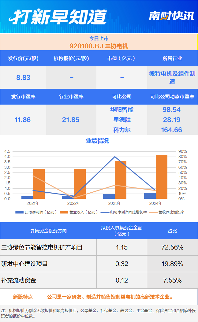 9月8日,北交所的三协电机(920100.BJ)上市。公司成立于2002 年,是一家研发、制造并销售控制类电机的高新技术企业。