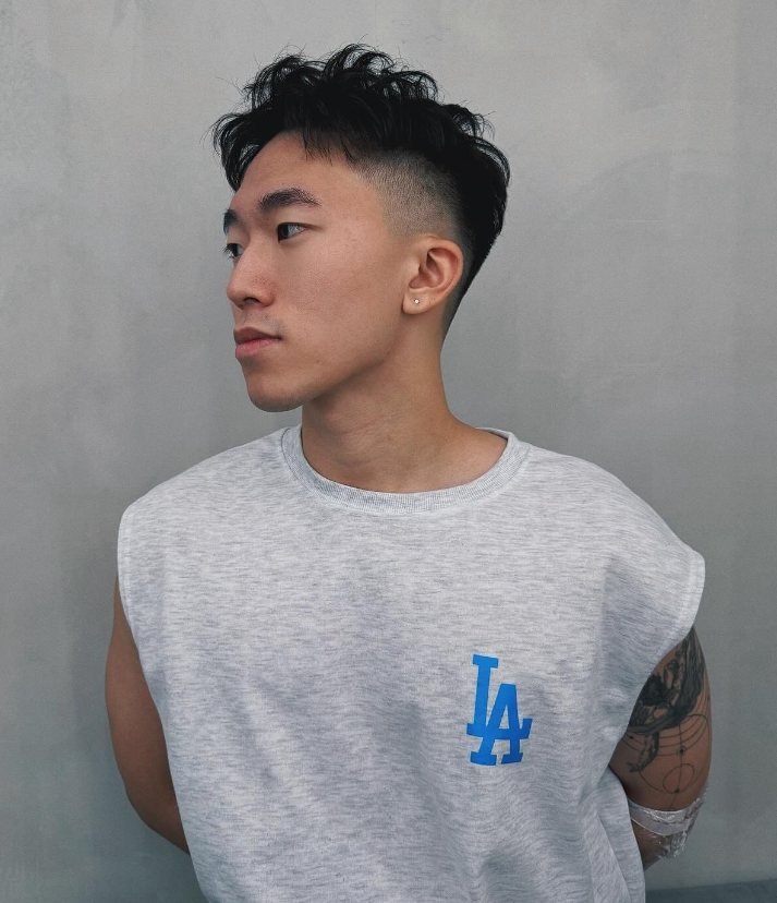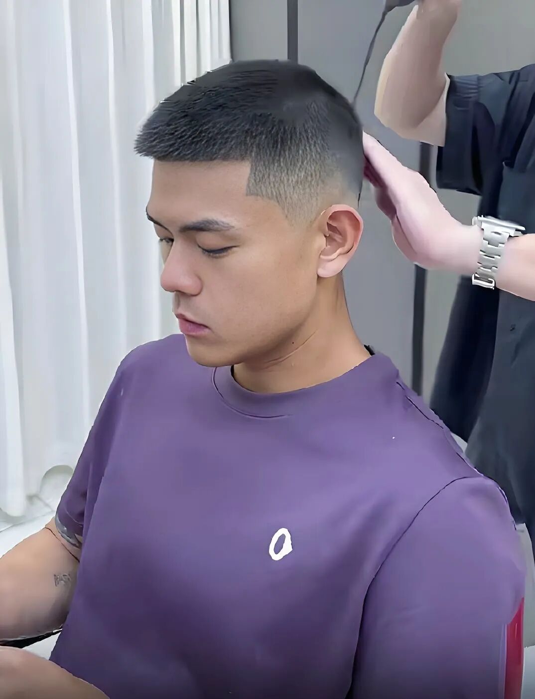 两侧采用推剪处理,长度控制在1-2厘米,凸显利落轮廓;顶部保留3-4厘米长度,搭配轻微短烫,打造自然蓬松的纹理,借助烫发增强发丝支撑力,避免粗硬发质显呆板、细软发质易坍塌的问题,日常打理简单,适配多种休闲场景。