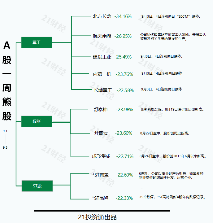 具体来看本期的最熊股,9月3日、4日北方长龙连续两个交易日“20CM”跌停,9月5日弱势反弹收涨1.01%;但过去一周累计跌幅仍达34.16%。