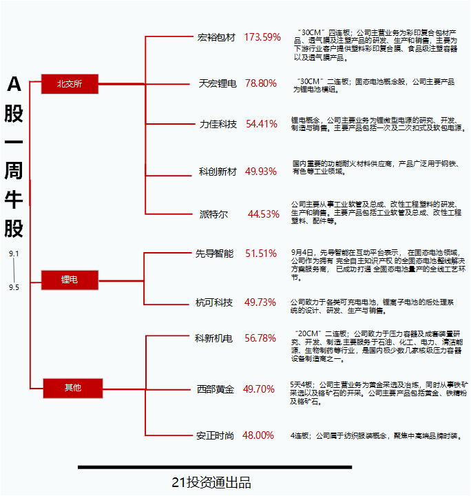 “30CM”四连板,大牛股宏裕包材年内涨幅居北证首位本期牛股榜中(剔除近1月上市的次新股,下同),北交所大牛股宏裕包材(837174.BJ)走出“30CM”四连板,单周大涨超173%,年内涨幅在北证A股中排名第一;此外,另一只北交所个股天宏锂电(873152.BJ)单周涨78.8%,力佳科技(835237.BJ)、科创新材(833580.BJ)、派特尔(836871.BJ)等多只北交所股票上榜牛股榜单。此外,科新锂电(300092.SZ)单周涨56.78%,固态电池概念股先导智能(300450.SZ)累计涨51.51%。