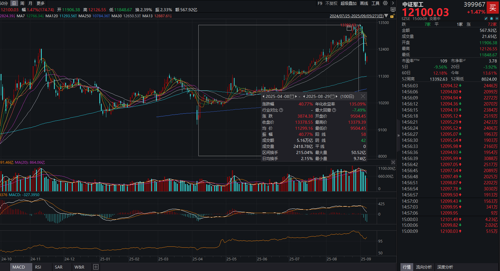 过去一周,前期持续上涨的军工板块回调明显,以中证军工指数(399967)为例,9月份的五个交易日(9.1-9.5)中,该指数累计跌9.56%。而如果拉长时间来看,该指数前期持续走强,自4月8日以来一路震荡上行,截至8月末,累计涨幅超40%。